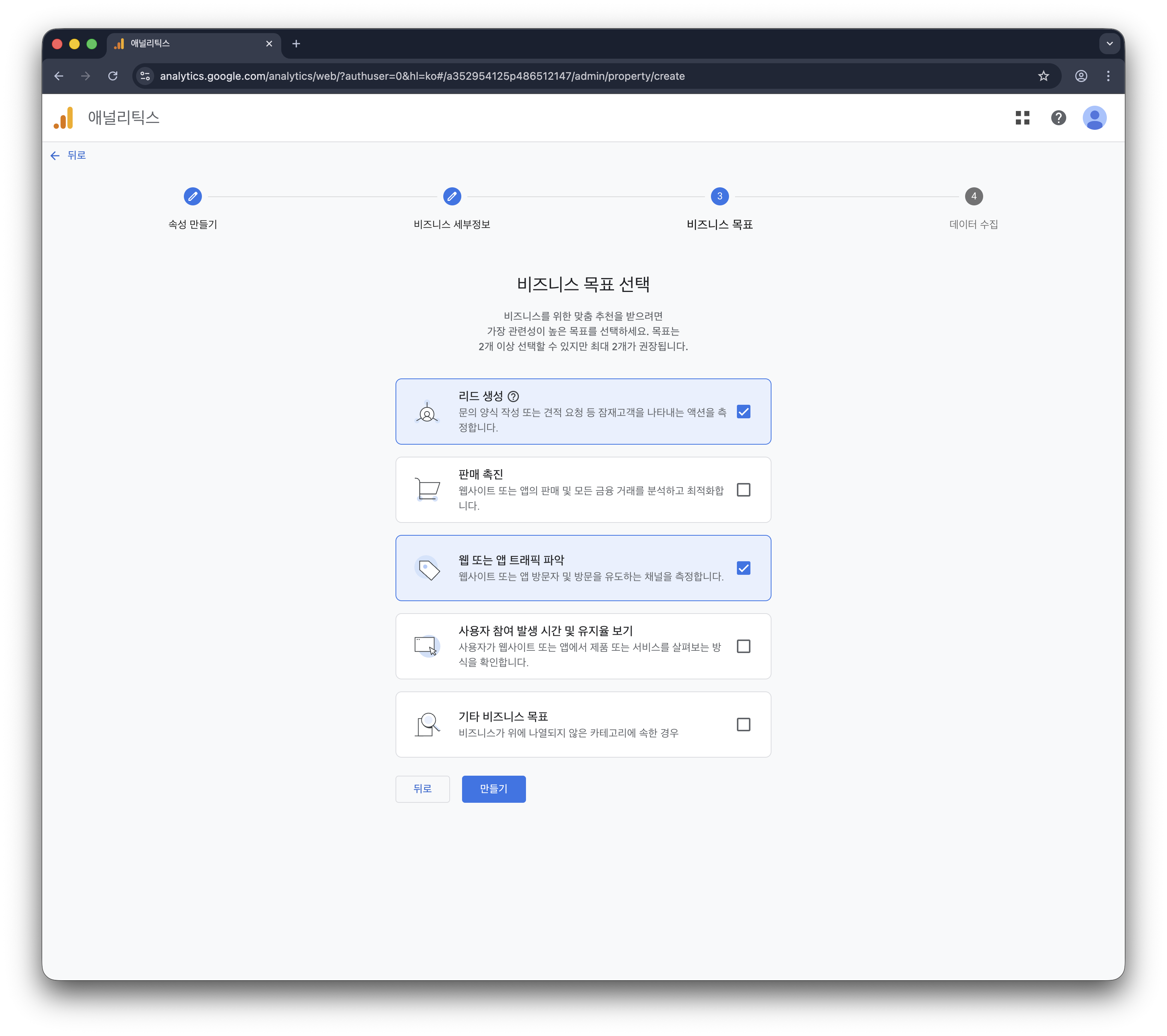 아래의 항목에서 나에게 맞는 비즈니스 목표를 설정해주면 된다